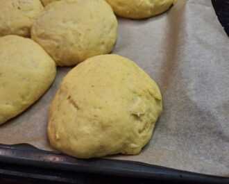 Wyrośnięte ciasto przekładamy na oprószony mąką blat, formujemy ~8 bułek i układamy na blasze wyłożonej papierem do pieczenia. Przykrywamy i dajemy im jeszcze chwilę podrosnąć do czasu nagrzania się piekarnika do 200 stopni. Przed wstawieniem do piekarnika smarujemy jajkiem wymieszanym z łyżką miodu (~20g), opcjonalnie możemy dodatkowo posypać cukrem waniliowym. Pieczemy przez ~22 minuty w temperaturze 200 stopni.