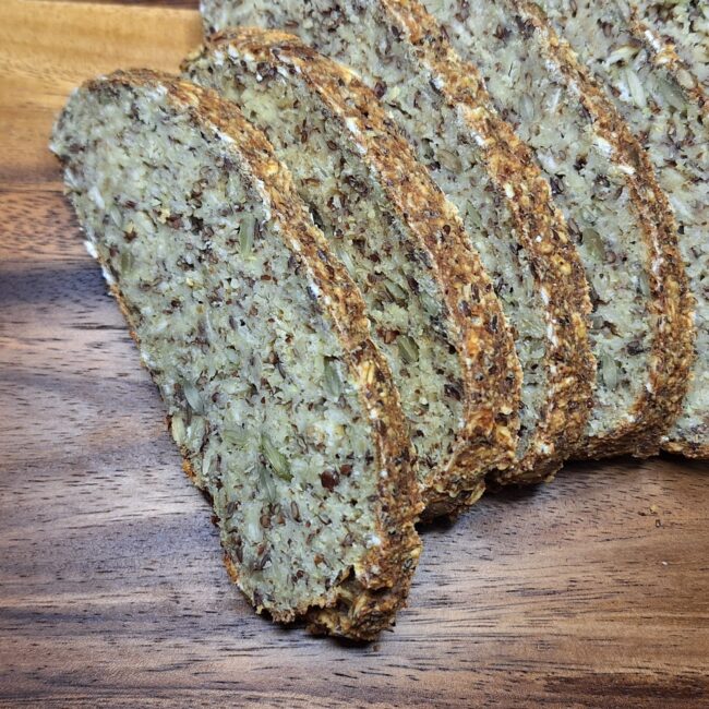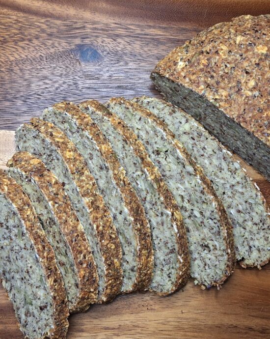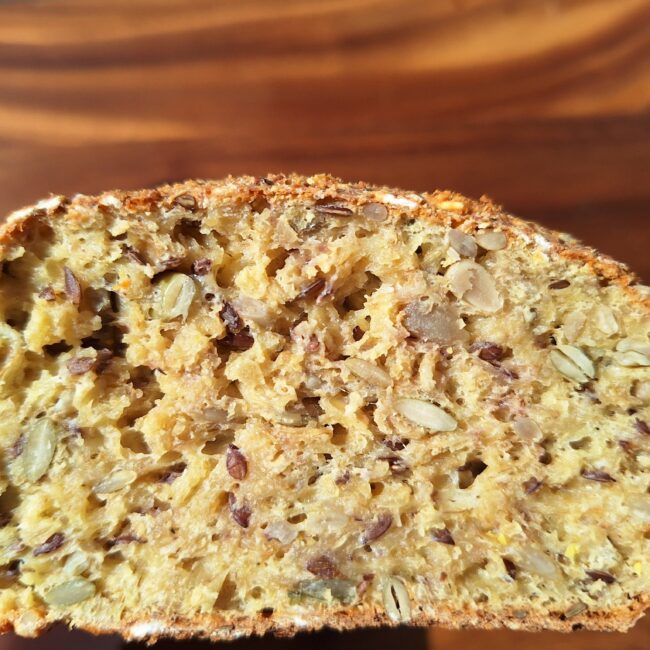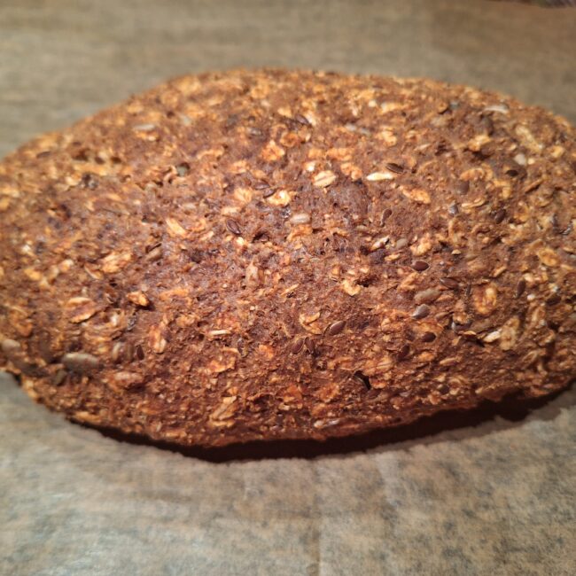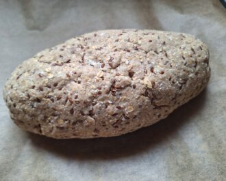 Mielimy połowę płatków owsianych (150g) i połowę siemienia (20g). W dużej misce mieszamy ręcznie wszystkie składniki (biały ser, jajka, sól, proszek do pieczenia, płatki owsiane całe i mielone, siemię całe i zmielone, pestki słonecznika i dyni). Formujemy bochenek.