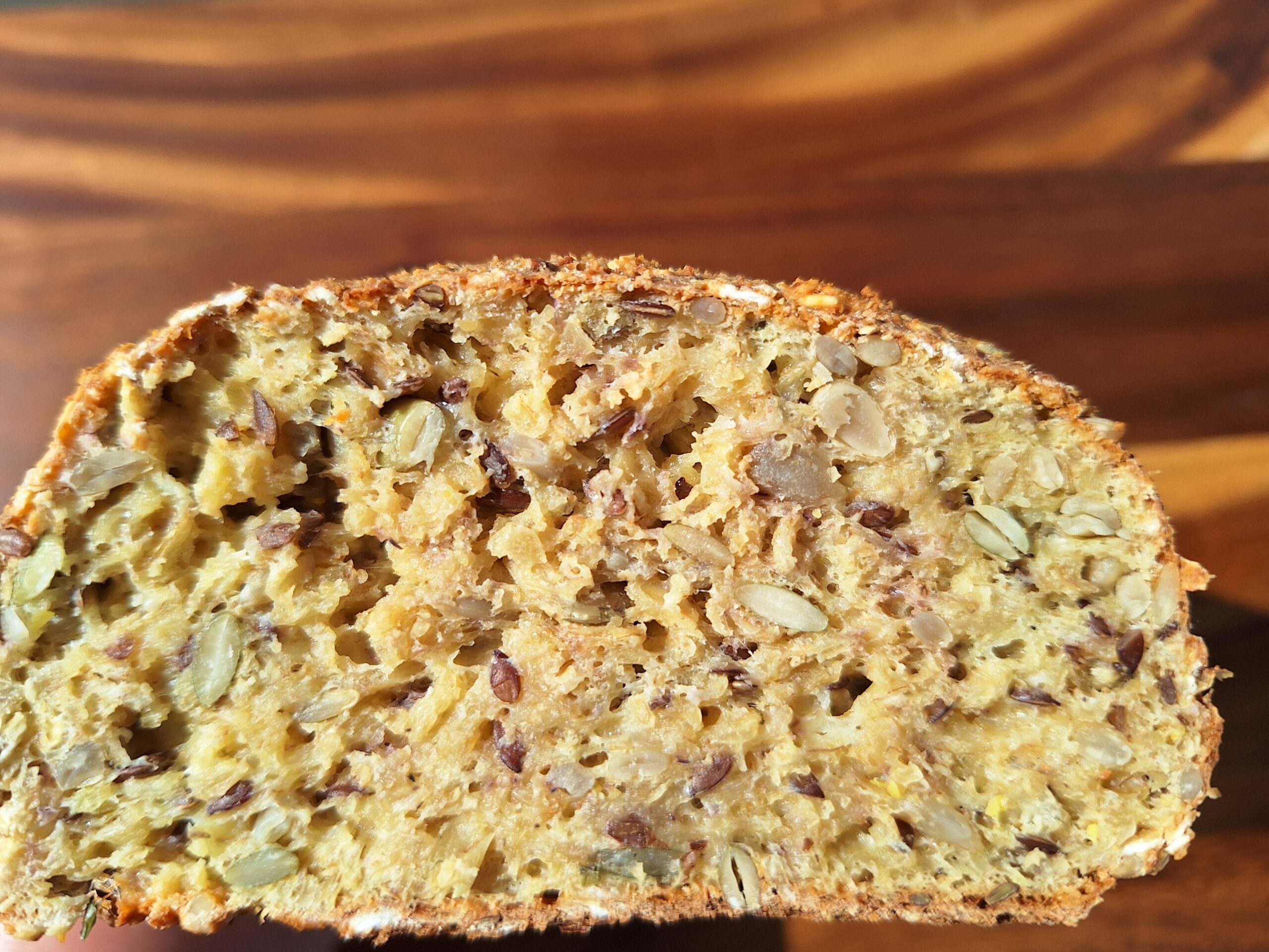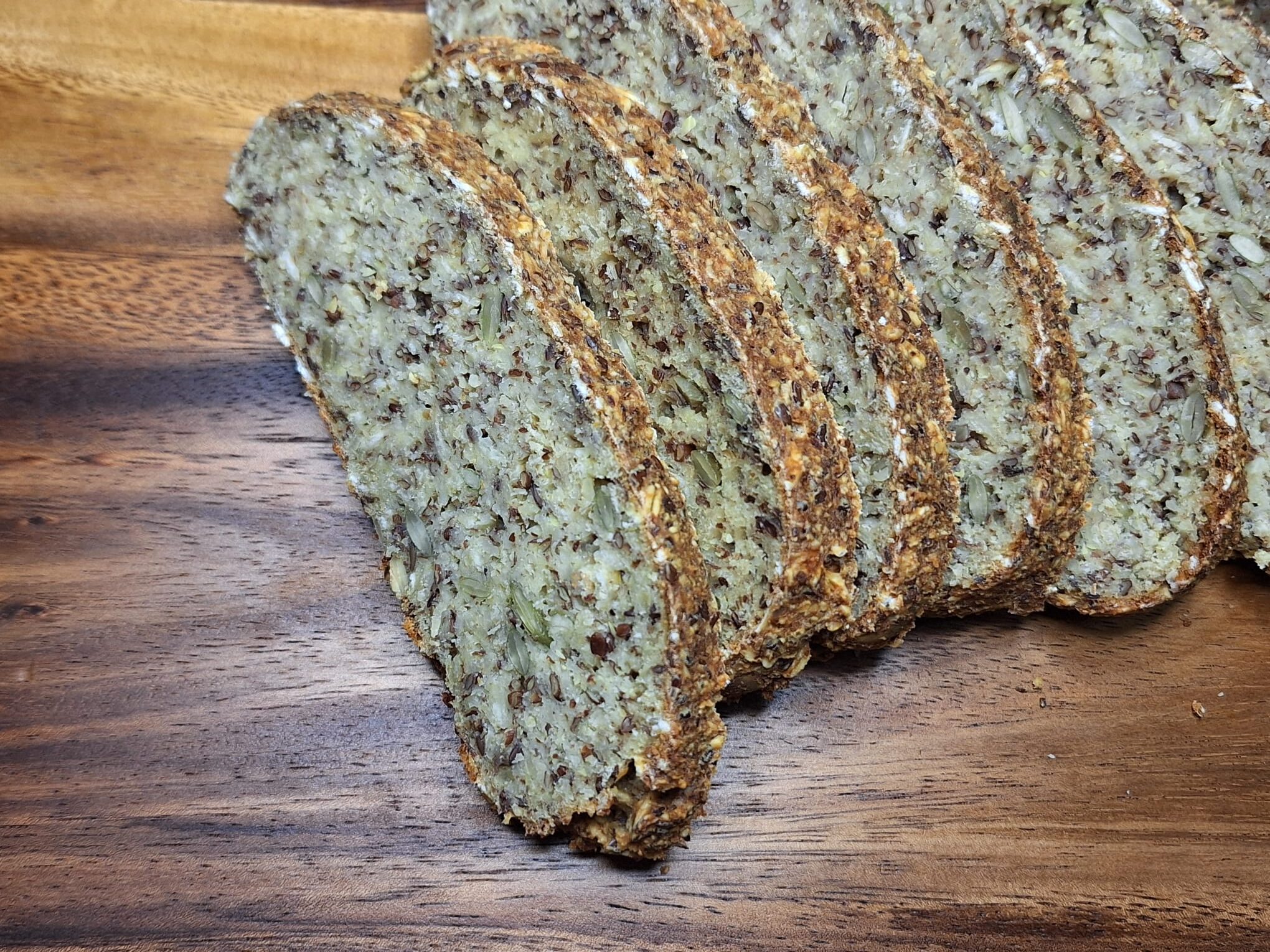 Mielimy połowę płatków owsianych (150g) i połowę siemienia (20g). W dużej misce mieszamy ręcznie wszystkie składniki (biały ser, jajka, sól, proszek do pieczenia, płatki owsiane całe i mielone, siemię całe i zmielone, pestki słonecznika i dyni). Formujemy bochenek.