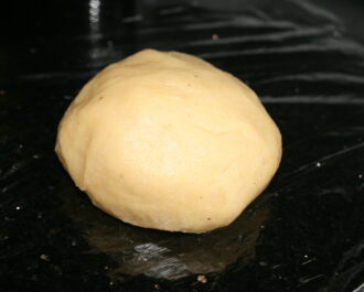 Formujemy z ciasta kulę, zawijamy ją w folię spożywczą i schładzamy w lodówce przez ~30 minut.