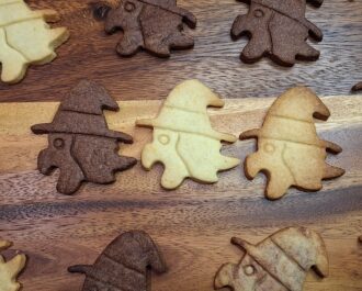 Ciasto rozwałkowujemy lub rozgniatamy dłonią i wycinamy kształty ciastek. Układamy na blasze wyłożonej papierem do pieczenia.