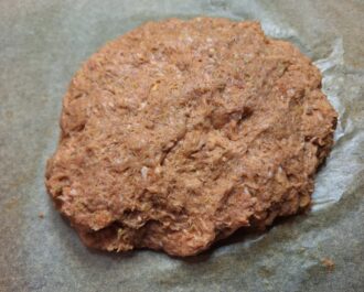 Masę mięsną rozwałkowujemy na cienki placek przez papier do pieczenia (złożony na pół).