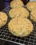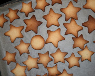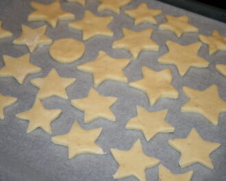 Ciasto rozwałkowujemy lub rozgniatamy dłonią i wycinamy kształty ciastek. Układamy na blasze wyłożonej papierem do pieczenia.