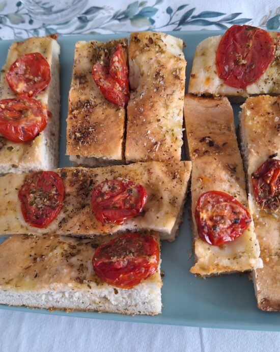 Rozgrzewamy piekarnik do temp. 200°C. Blachę wykładamy papierem do pieczenia. Dłonie natłuszczamy oliwką i przekładamy wyrośnięte ciasto na przygotowaną wcześniej blachę. Robimy palcami zagłębienia w cieście. Wkładamy do nich przekrojone na pół pomidorki. Smarujemy powierzchnię całego placka (łącznie z pomidorkami) resztą oliwki z oregano, solą i przeciśniętym przez praskę czosnkiem. Piec 20-25 min (200°C).