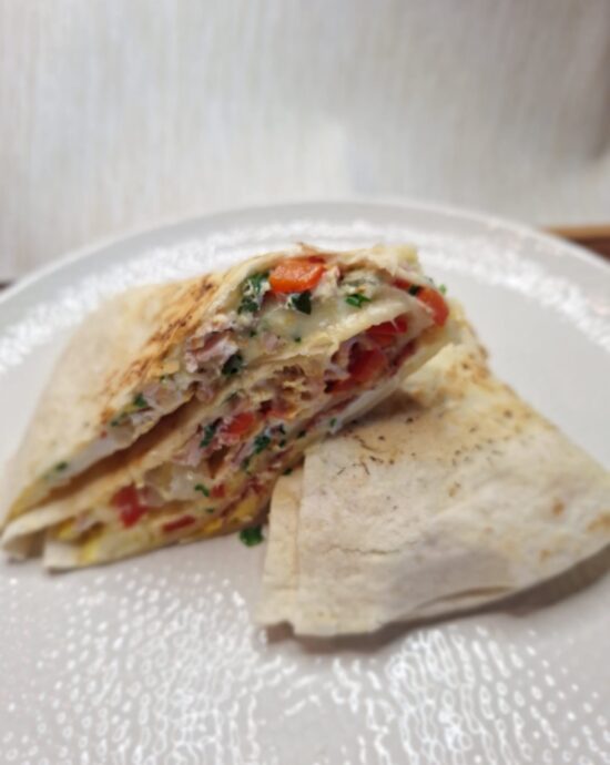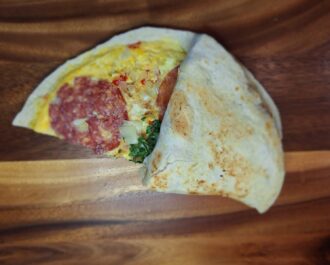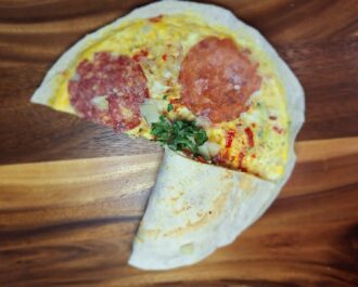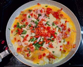 Na patelnię wrzucamy wszystkie składniki żeby się lekko zeszkliły (na końcu wlewamy rozbełtane posolone jajka) i przykrywamy plackiem tortilli aby się skleił z omletem. Po kilku minutach wyjmujemy z patelni odwracając omletem do góry (tortilla jako spód).