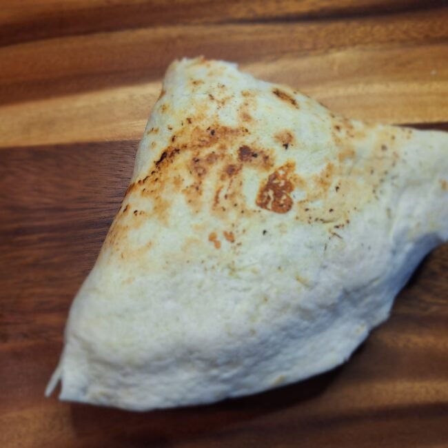 Kroimy do połowy placka i pierwszą część zawijamy.
