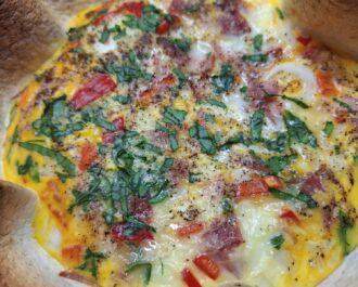 Do rozbełtanych i posolonych jajek dodajemy pozostałe składniki, doprawiamy pieprzem.