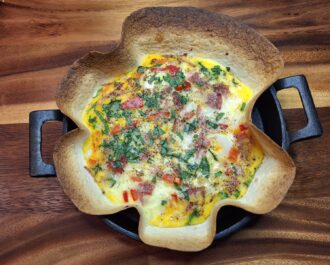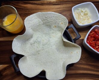 Pieczemy ~15 minut w 180° stopniach. Alternatywnie możemy lepiej dobrać naczynie do zapiekania tak aby ranty placka tortilli lepiej się mieściły ;)