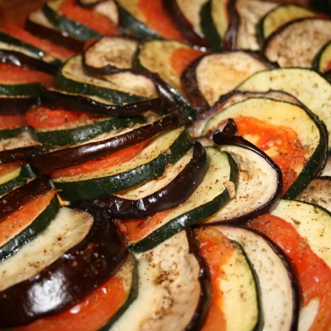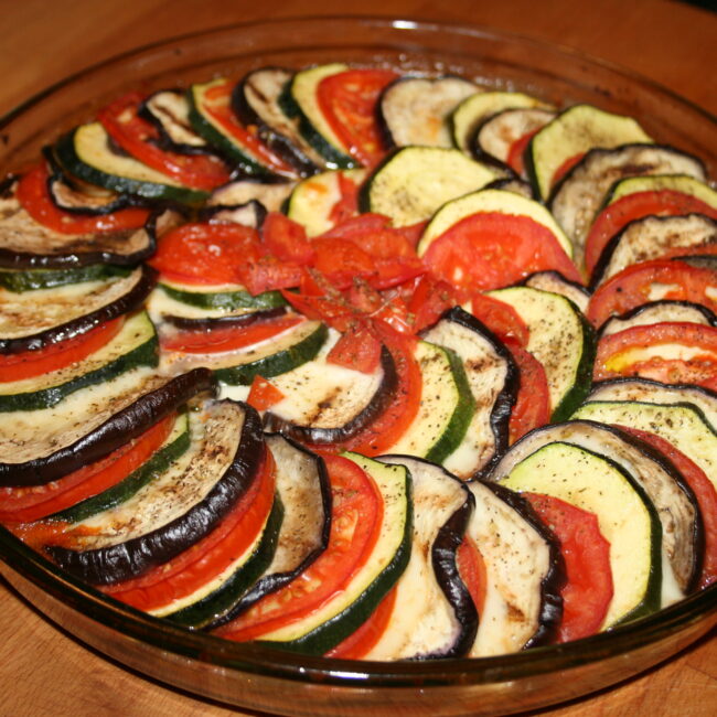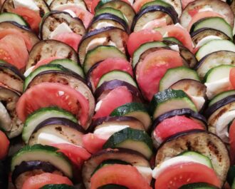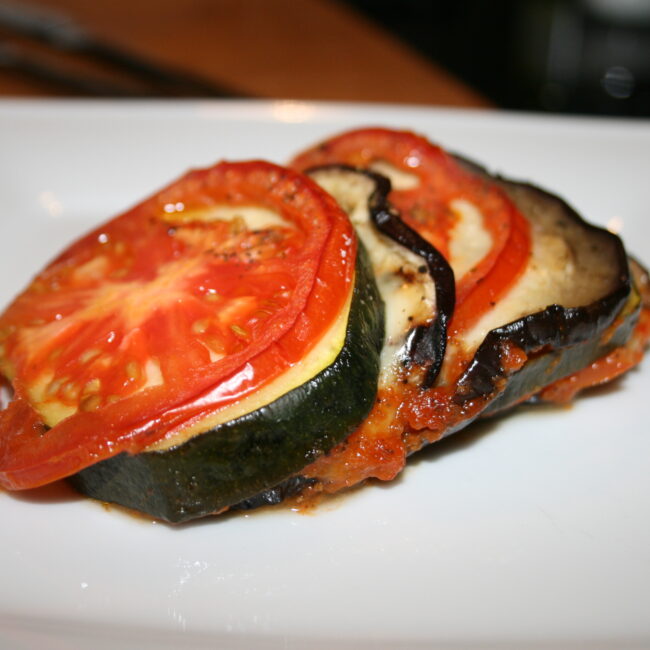 Do naczynia żaroodpornego (lub blachy do ciasta) wlewamy zmiksowany sos - na nim układamy mozaikę z warzyw i sera (bakłażan, ser, pomidor, cukinia - i tak w kółko). Posypujemy ziołami prowansalskimi i pieprzem. Przykrywamy folią aluminiową i pieczemy ~60 minut w temperaturze 200 stopni. Po godzinie pieczenia zdejmujemy folię i podpiekamy jeszcze ~10 minut bez przykrycia (opcja grill).