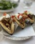 bakłażan: kroimy w plastry, solimy żeby puścił sok, odstawiamy na sitku do odsączenia, grillujemy - - na beztłuszczowej patelni / grillu (bez tego etapu może dodać zapiekance gorzki smak)
