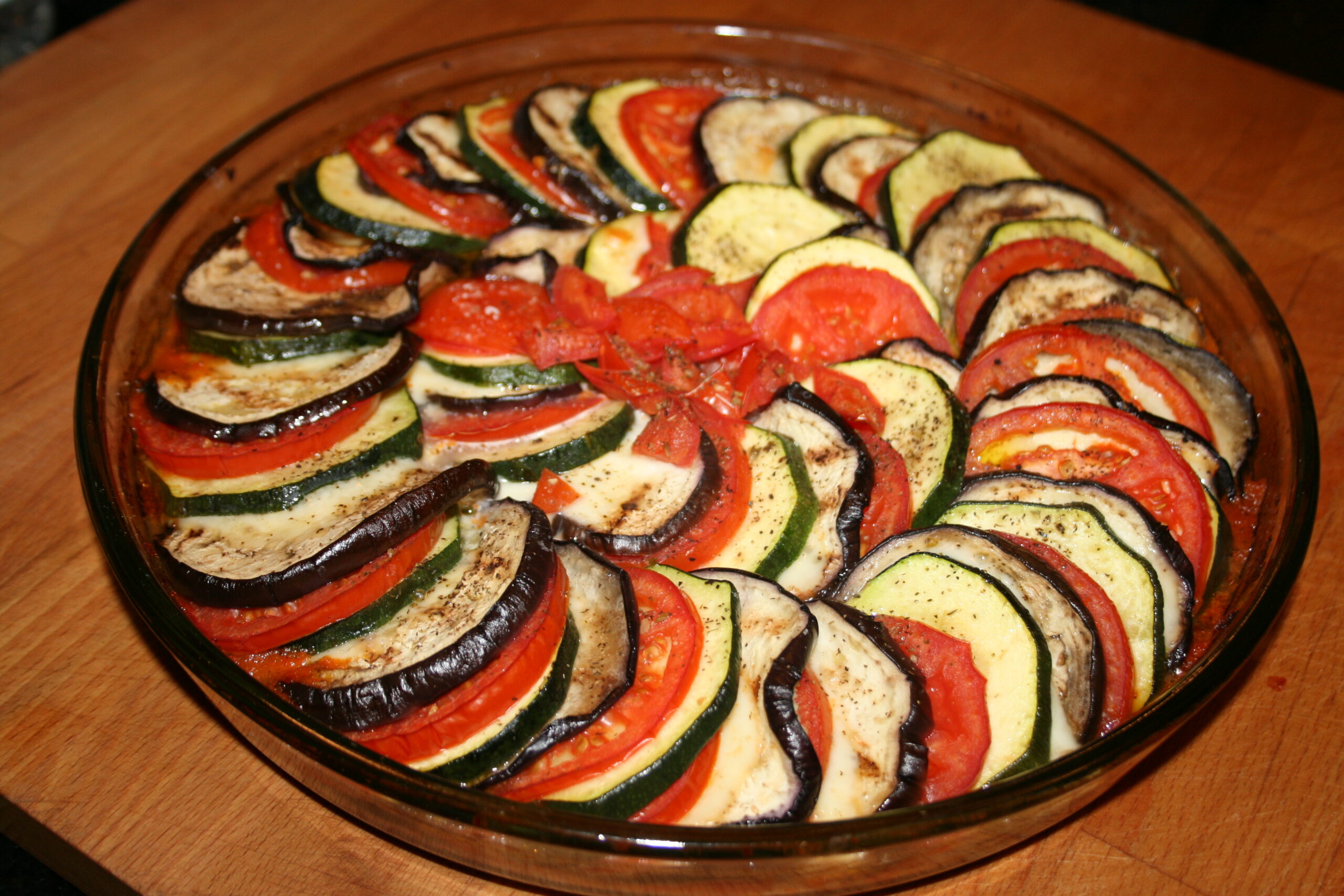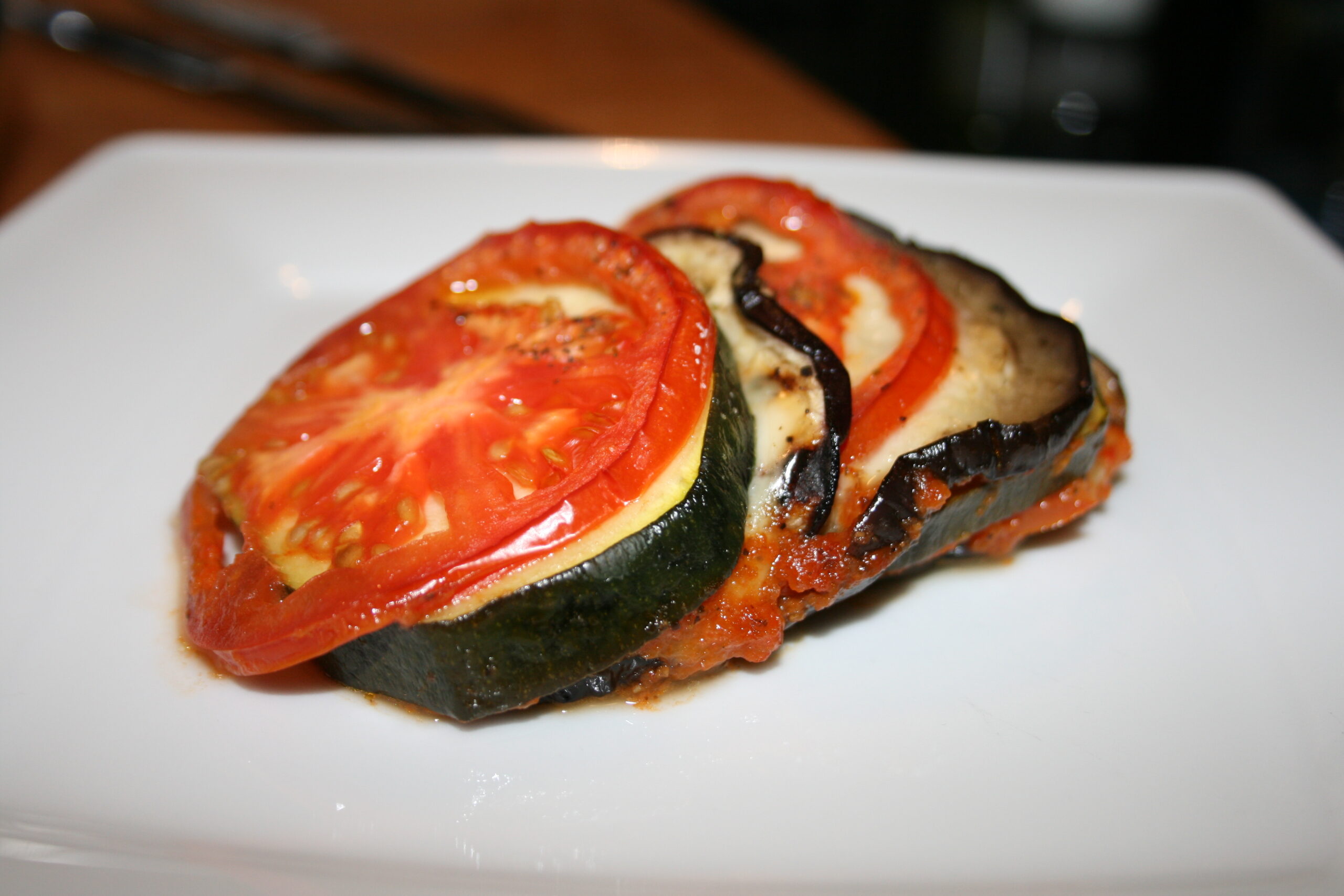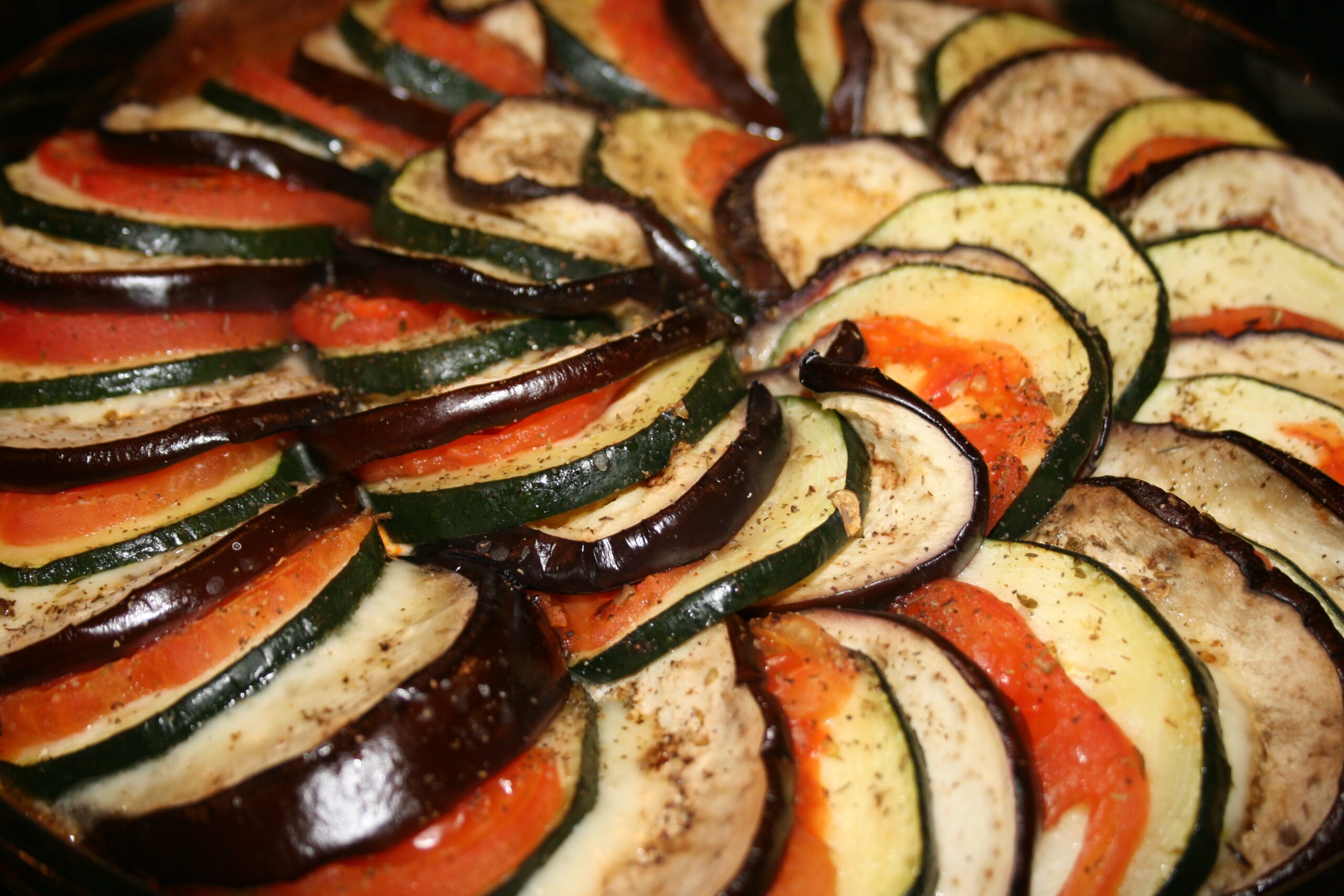 Do naczynia żaroodpornego (lub blachy do ciasta) wlewamy zmiksowany sos - na nim układamy mozaikę z warzyw i sera (bakłażan, ser, pomidor, cukinia - i tak w kółko). Posypujemy ziołami prowansalskimi i pieprzem. Przykrywamy folią aluminiową i pieczemy ~60 minut w temperaturze 200 stopni. Po godzinie pieczenia zdejmujemy folię i podpiekamy jeszcze ~10 minut bez przykrycia (opcja grill).