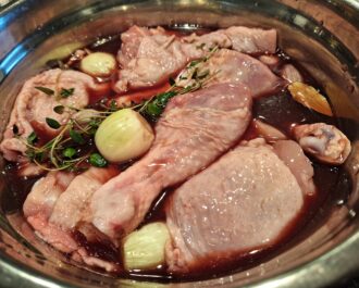 W dużej misce marynujemy mięso w winie: kurczaka przyprawiamy solą i pieprzem, dodajemy obrane szalotki, obrane ząbki czosnku, liście laurowe i tymianek. Przykrywamy i zostawiamy na kilka godzin w lodówce.