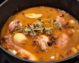 Zalewamy przecedzonym winem z marynaty, dodajemy bulion, koncentrat pomidorowy + ponownie liście laurowe i tymianek. Jeśli mamy zbyt mało płynu dopełniamy wodą tak żeby zbyt dużo składników nie wystawało. Dusimy przez minimum 1 godzinę. Pod koniec doprawiamy dodatkowo solą i pieprzem.