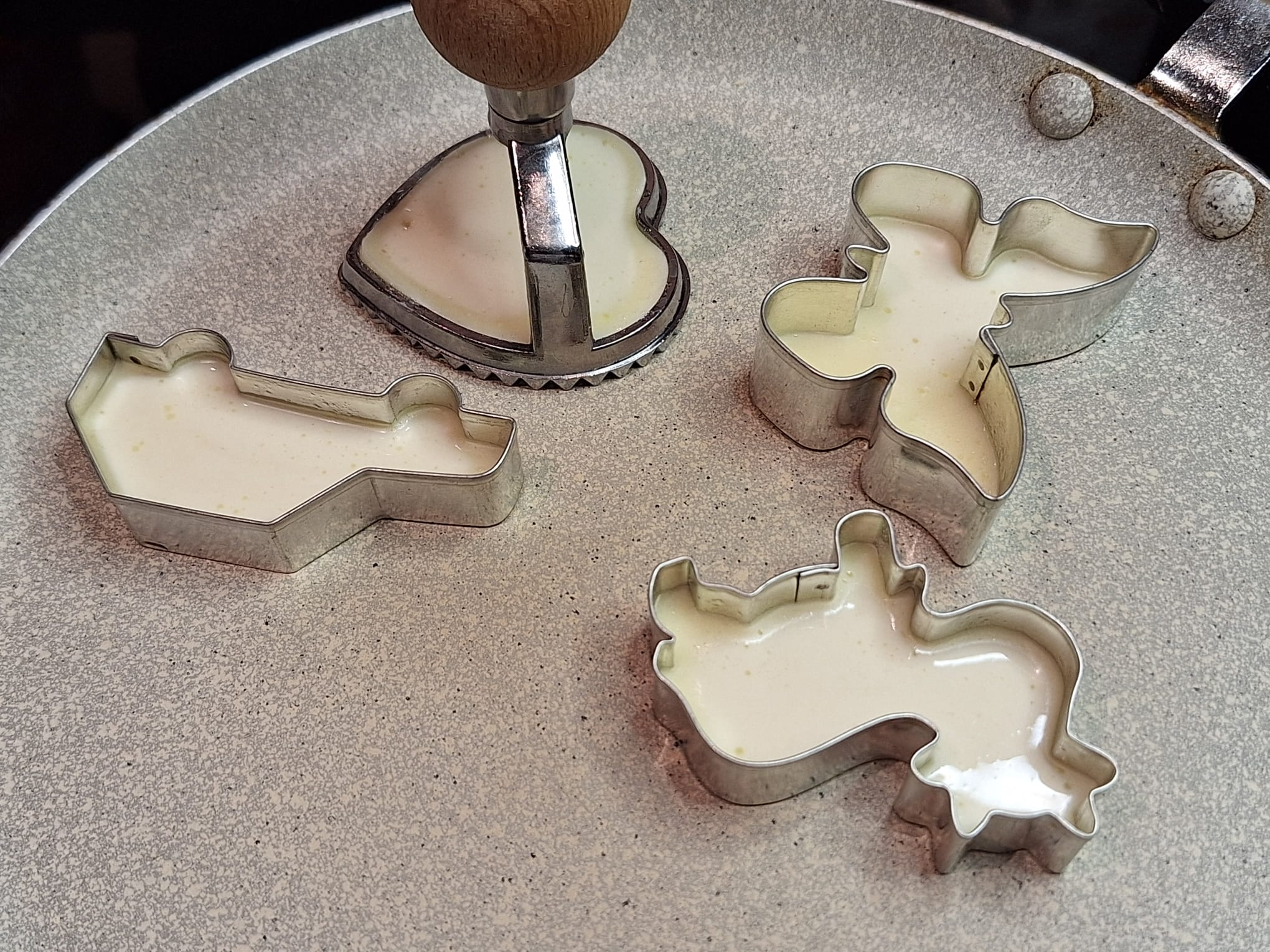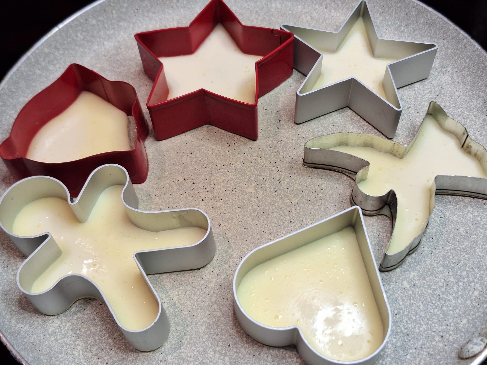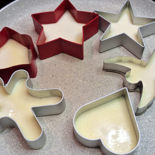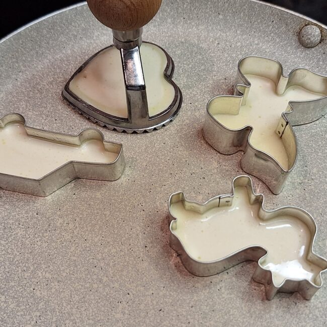 Używamy foremek tylko z takich materiałów które nie roztopią nam się na patelni pod wpływem ciepła (+dobrze jest je posmarować od wewnątrz lekko masłem żeby naleśniki łatwo nam wyszły z formy a nie przyssały się do niej bez możliwości wyjęcia ich bez utraty kształtu…).