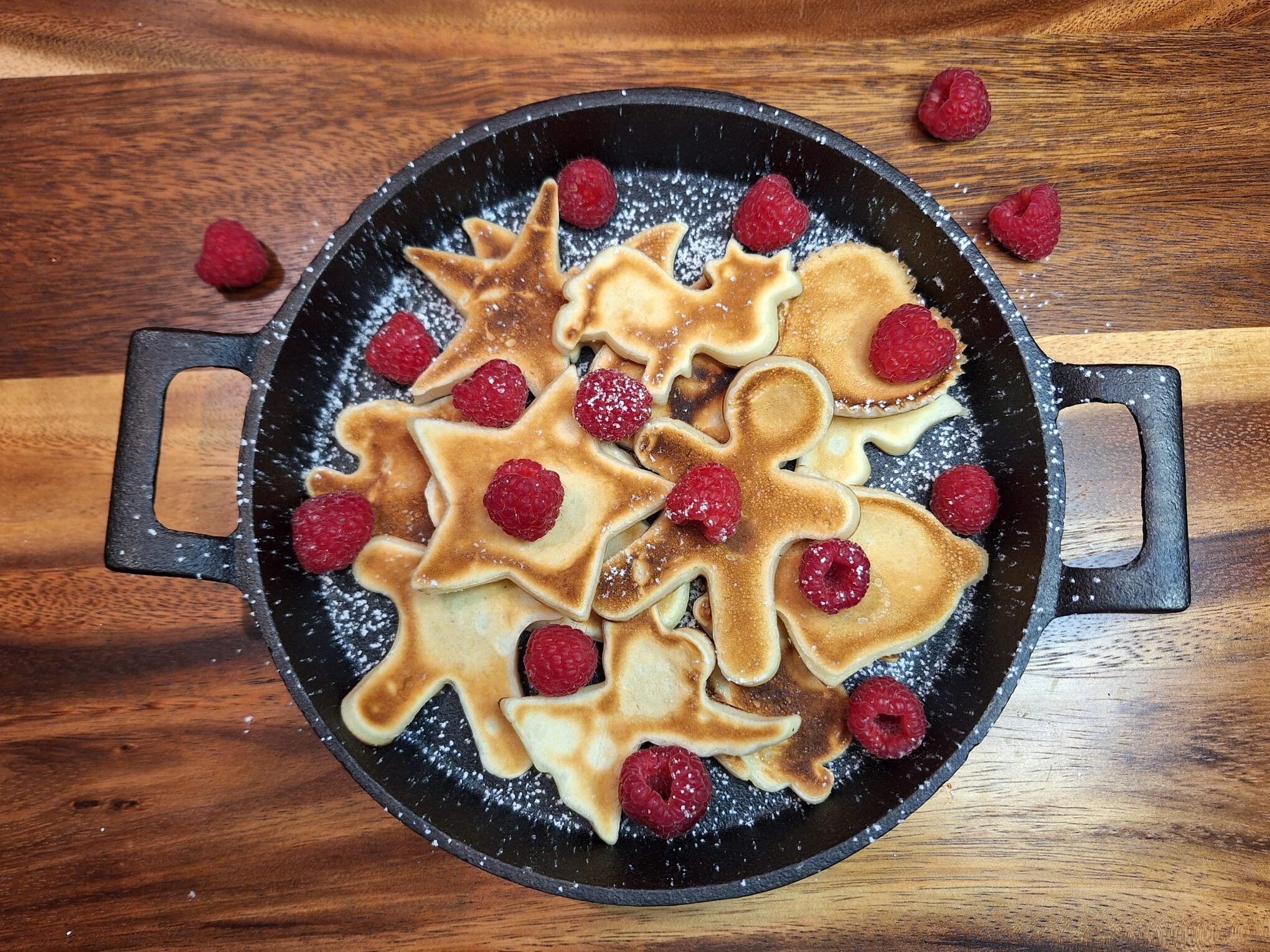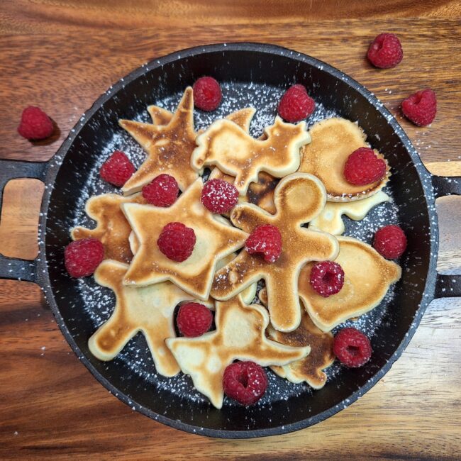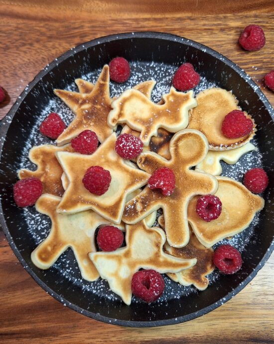 Miksujemy wszystkie składniki na jednolitą masę (dodajemy roztopioną łyżkę masła aby ciasto nie przywierało). Smażymy porcje w kształcie foremek – aby przełożyć je na drugą stronę musimy je już wyjąć z patelni. Po wyjęciu dekorujemy owocami (np. maliny) i cukrem pudrem.