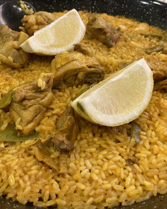 - Co do zasady gotujemy paellę bez przykrycia – ryż ugotuje się na względnie sypko a na dnie powinien powstać lekko przypieczony spód (tzw. socarrat)