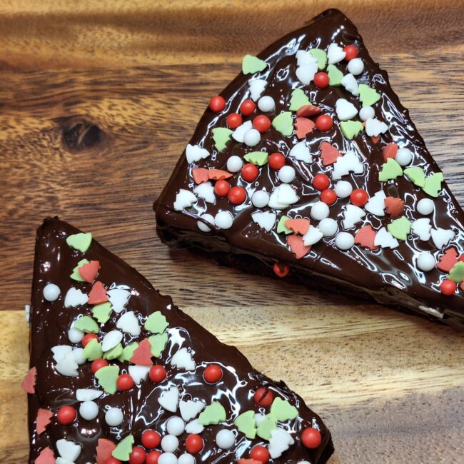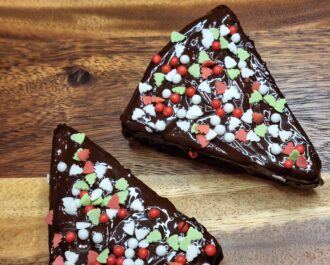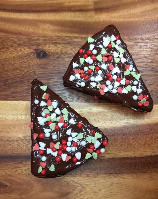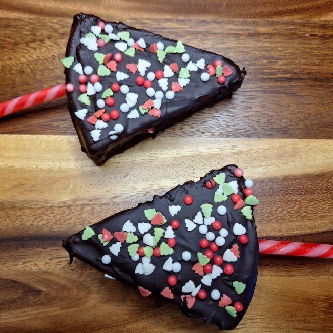 Czekoladę roztapiamy w kąpieli wodnej i polewamy monoporcje płynna polewą czekoladową (jeśli podczas roztapiania będziemy ją mieszać pozostanie zwarta i nie utraci koloru - mieszajmy), dekorujmy posypką. Choinkom można jeszcze dorobić "pień" wbijając w ciasto patyczki do lodów, do szaszłyków czy gwiazdkowe laski lizakowe.