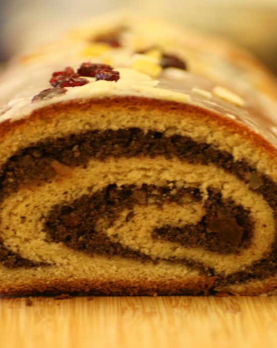 Wyrośnięte ciasto dzielimy na 2 równe części, każdą rozwałkowujemy na oprószonym mąką blacie na kształt zbliżony do prostokąta o grubości ~5 mm. Powstały placek smarujemy roztrzepanym białkiem (ranty pozostawiamy czyste bo biało utrudni sklejenie rolady). Na oba prostokąty nakładamy po połowie masy makowej (zostawiając wolne brzegi ~1,5 cm). Zwijamy w roladę, sklejamy ją aby była szczelna, owijamy dość luźno w papier do pieczenia (w rulon). Obie strucle kładziemy obok siebie na blasze, przykrywamy ściereczką i zostawiamy na kolejne ~20 minut.