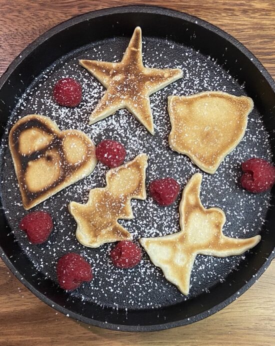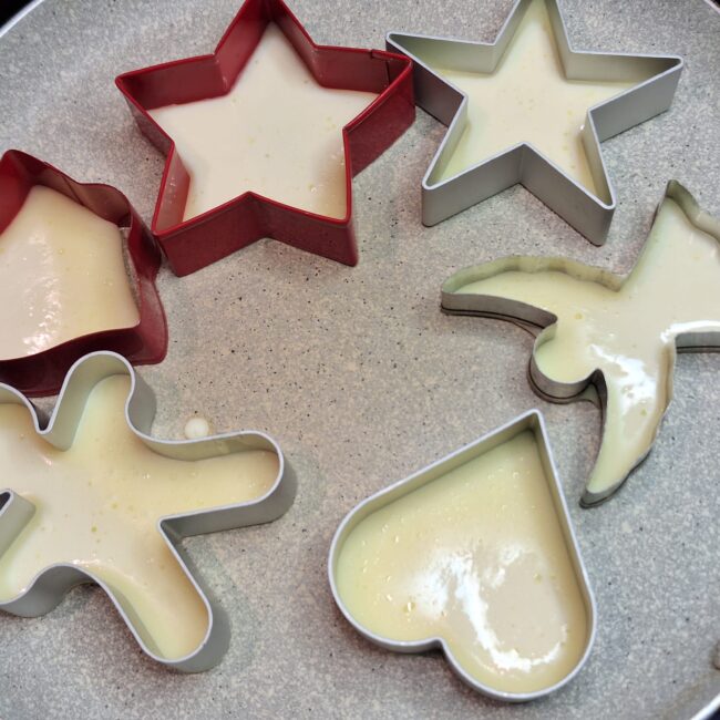 Uwaga: używamy foremek tylko z takich materiałów które nie roztopią nam się na patelni pod wpływem ciepła (+dobrze jest je posmarować od wewnątrz lekko masłem żeby naleśniki łatwo nam wyszły z formy a nie przyssały się do niej bez możliwości wyjęcia ich bez utraty kształtu…).