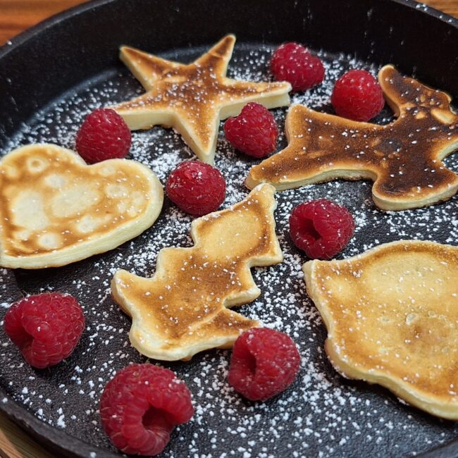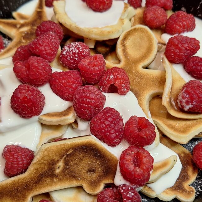 Miksujemy wszystkie składniki na jednolitą masę (dodajemy roztopioną łyżkę masła aby ciasto nie przywierało). Smażymy porcje w kształcie foremek – aby przełożyć je na drugą stronę musimy je już wyjąć z patelni. Po wyjęciu dekorujemy owocami (np. maliny) i cukrem pudrem.