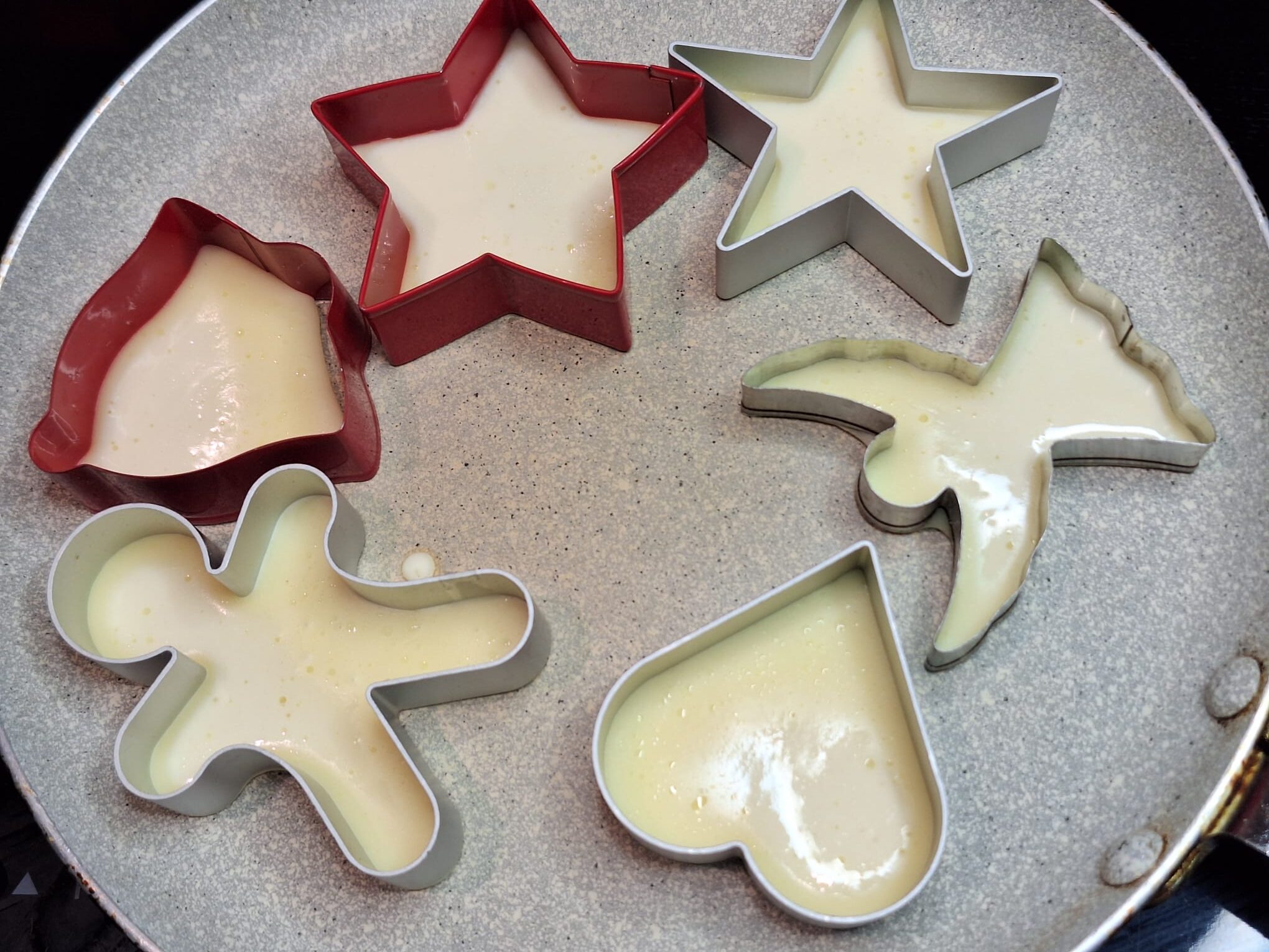 Uwaga: używamy foremek tylko z takich materiałów które nie roztopią nam się na patelni pod wpływem ciepła (+dobrze jest je posmarować od wewnątrz lekko masłem żeby naleśniki łatwo nam wyszły z formy a nie przyssały się do niej bez możliwości wyjęcia ich bez utraty kształtu…).