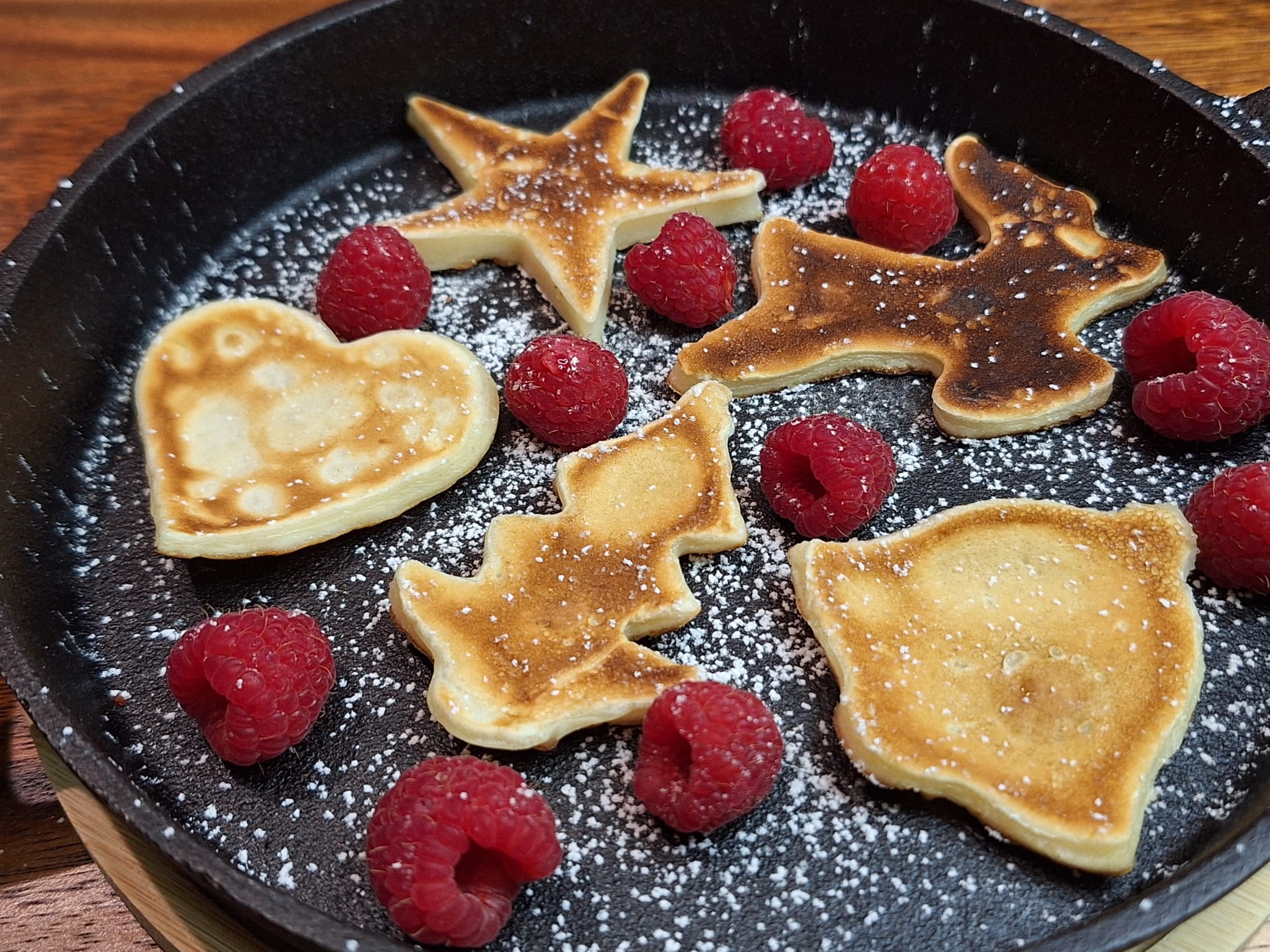 Miksujemy wszystkie składniki na jednolitą masę (dodajemy roztopioną łyżkę masła aby ciasto nie przywierało). Smażymy porcje w kształcie foremek – aby przełożyć je na drugą stronę musimy je już wyjąć z patelni. Po wyjęciu dekorujemy owocami (np. maliny) i cukrem pudrem.