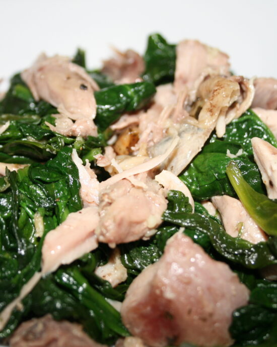 Jak szpinak nie jest już wodnisty (odparuje nadmiar soku) dodajemy poszarpane kawałki kurczaka, mieszamy i chwilę podgrzewamy, żeby smaki się połączyły. Dekoracyjnie możemy posypać startym parmezanem.