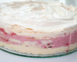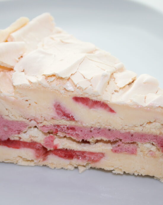Przekładamy blaty bezowe lodami (lub wybranym kremem tortowym - także się zmrozi) i dorzucamy pomiędzy warstwy trochę pokrojonych truskawek. Środkową warstwę możemy mocno spłaszczyć, wierzchnią przykrywamy delikatniej aby nie popękała.