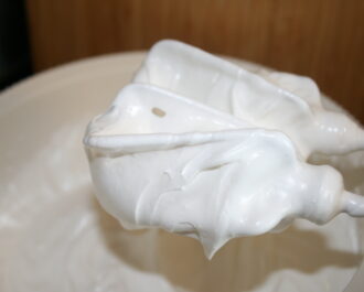 Białka ubijamy ze szczyptą soli dodając stopniowo cukier. Następnie na niższych obrotach miksera dodajemy mąkę ziemniaczaną i sok z cytryny. Masa bezowa musi być sztywna.