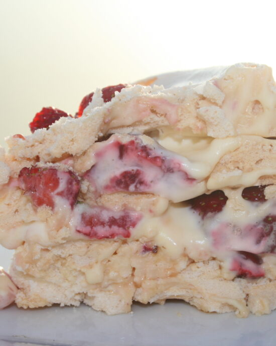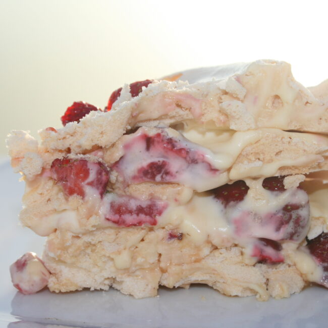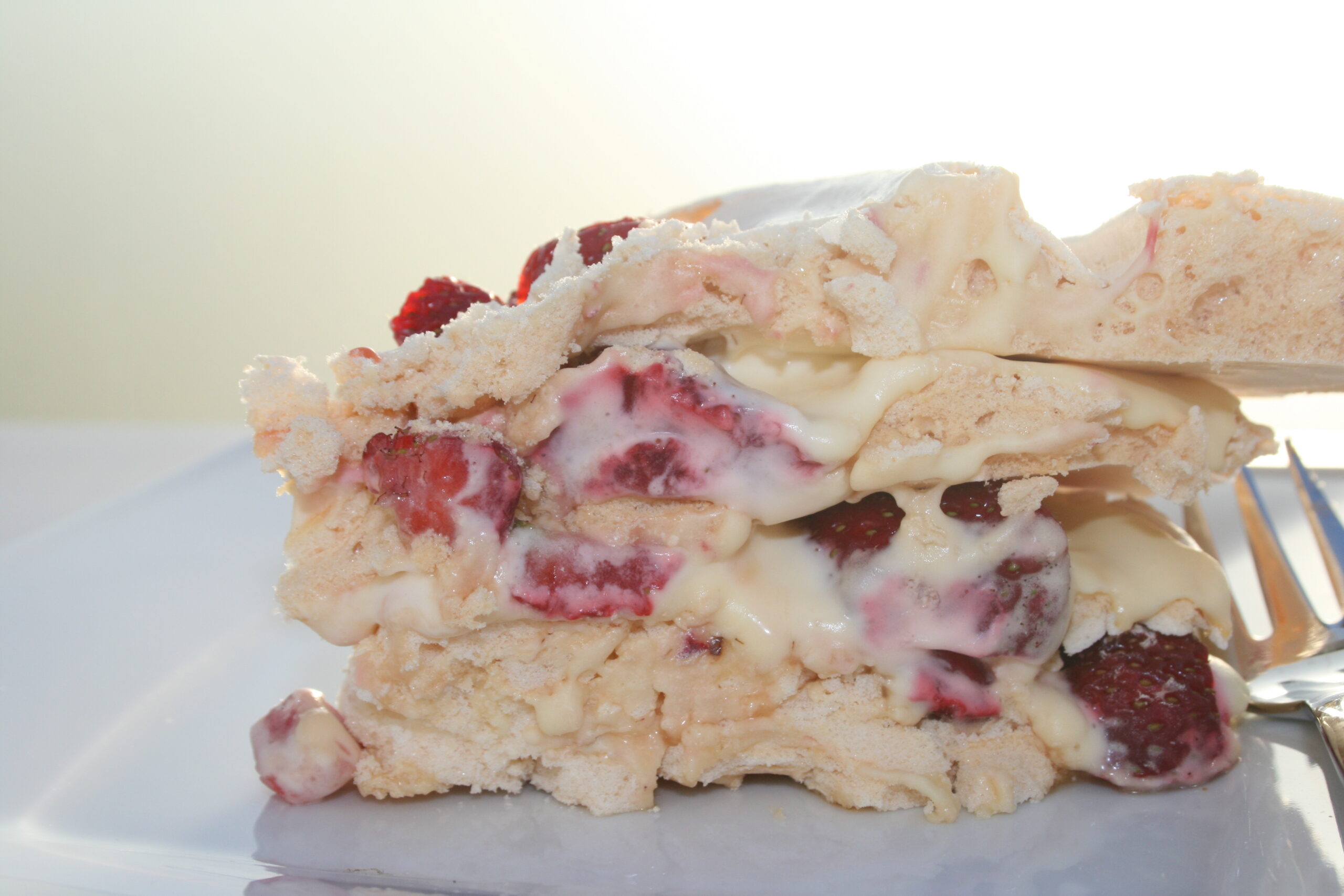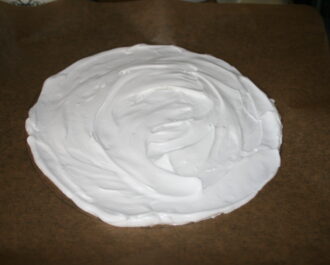 Formujemy blaty bezowe na blasze wyłożonej papierem do pieczenia (możemy sobie odrysować ołówkiem talerz aby mieć blaty identycznej wielkości). Suszymy je w piekarniku w temperaturze 110 stopni na programie termoobieg (bez grzania góra/dół) przez ~2,5 godziny. W zależności od tego jak sobie radzi nasz piekarnik z piętrowym pieczeniem pieczemy 3 blaty razem (ewentualnie co jakiś czas zamieniając miejscami) lub osobno każdy po kolei.