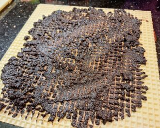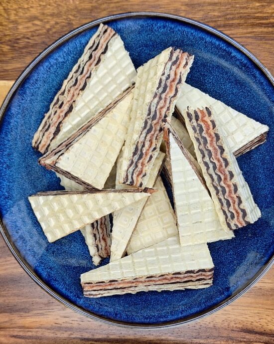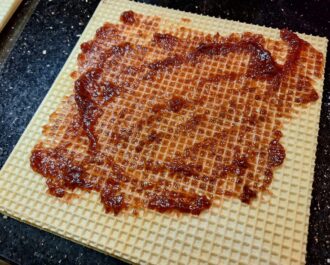 Składamy całą porcję wafli przekładając je w dowolnej kolejności masą czekoladową i dżemem. Zawijamy w folię spożywczą/aluminiową, przygniatamy dużą deską do krojonia, obciążamy, możemy wstawić do lodówki żeby masy stężały.