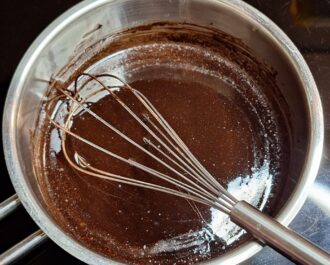 W rondelku rozpuszczamy masło, dodajemy cukier, kakao, mleko w proszku i 2 jajka. Cały czas mieszamy, zwłaszcza po dodaniu jajek aby płyn był gładki a nie z wmieszaną jajecznicą... Studzimy i na końcu dodajemy spirytus lub inny alkohol o preferowanym zapachu, którym pachnieć będą wafle.