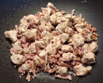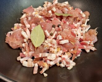 Pokrojone filety z indyka podduszamy z pokrojonym boczkiem, pieprzem, liśćmi laurowymi i zielem angielskim.