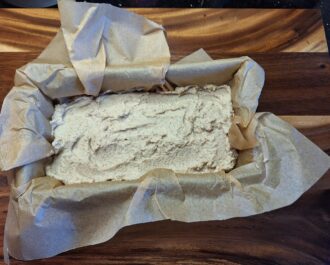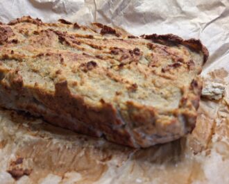 Pieczemy w formie wyłożonej papierem do pieczenia (lub posmarowanej masłem i obsypanej bułką tartą) w temperaturze 200 stopni przez ~60 minut.