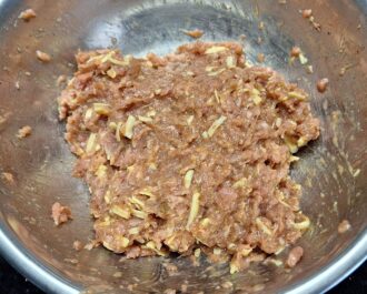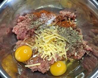 Do miski wsypujemy 2 jajka, mielone mięso drobiowe (u nas indyk), sól, czarny pieprz, papryka słodka, oregano i ~50g sera cheddar.