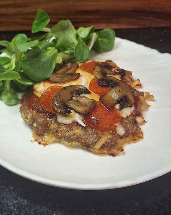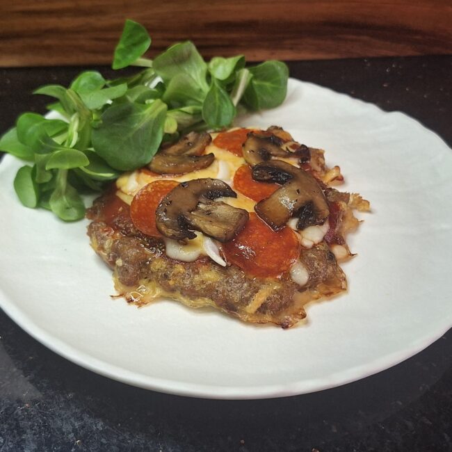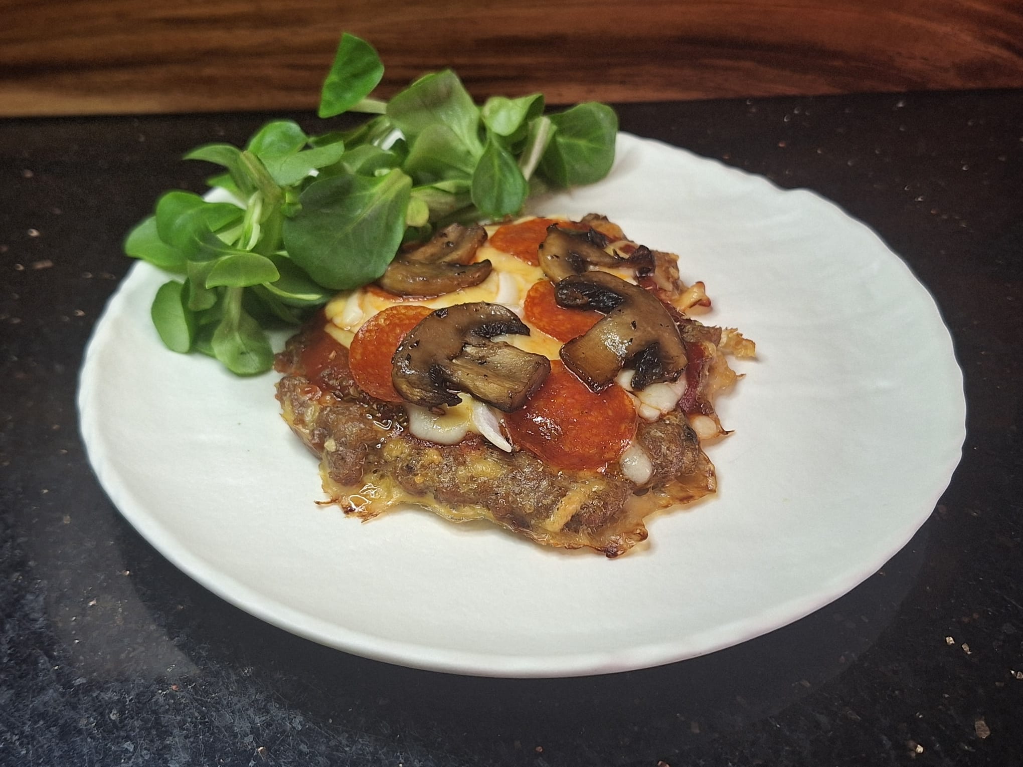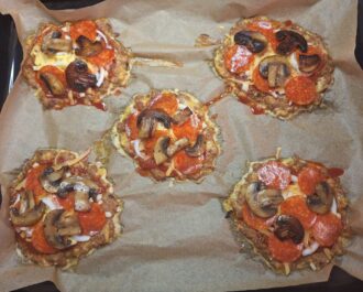 Na podpieczone blaty układamy ulubione dodatki (tutaj po 2 łyżki passaty pomidorowej, oregano, pozostałe ~50g sera cheddar, tarta mozarella, salami, piórka cebuli i zrumienione pieczarki).