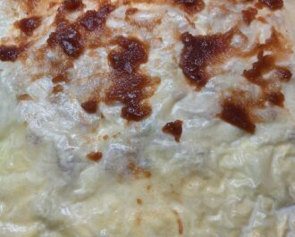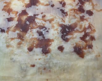 Na posmarowane ciasto filo wykładamy ser ricotta i rozsmarowujemy go po całej powierzchni. Przykrywamy kolejnym arkuszem ciasta filo, smarujemy pędzelkiem, przykrywamy następnym arkuszem ciasta i ponownie smarujemy płynem. Mamy więc już podwójne ciasto +ricottę + podwójne ciasto.