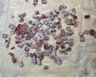 Na posmarowane ciasto filo wykładamy rabarbar. Przykrywamy kolejnym arkuszem ciasta filo, smarujemy pędzelkiem, przykrywamy następnym arkuszem ciasta i ponownie smarujemy płynem. Mamy więc już podwójne ciasto +ricottę + podwójne ciasto + rabarbar + podwójne ciasto.