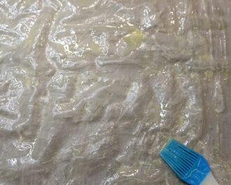 W kubku mieszamy wodę z mlekiem i oliwką, którym będziemy smarować ciasto filo. Rozkładamy na blacie pierwszy arkusz ciasta filo, smarujemy pędzelkiem, przykrywamy drugim arkuszem ciasta (sklei się) i ponownie smarujemy płynem.